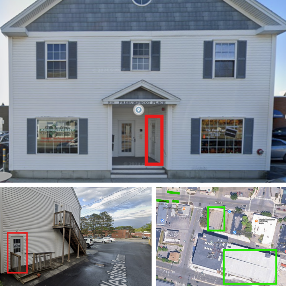 Entry to the building can be through the front or back first floor entrances (marked red). The front entrance has a couple of steps, and the back entrance has both stairs and a ramp. If entering the front via Main Street, you will see 918 Presumpscot Place on the building facade, use the door on the right and follow the hallway towards the back, you will see my office door on the left. If entering through the back, follow the hallway towards the front and the office door will be on your right. The office door is marked with an MFG – Mosley Financial Group sign, please come right in.